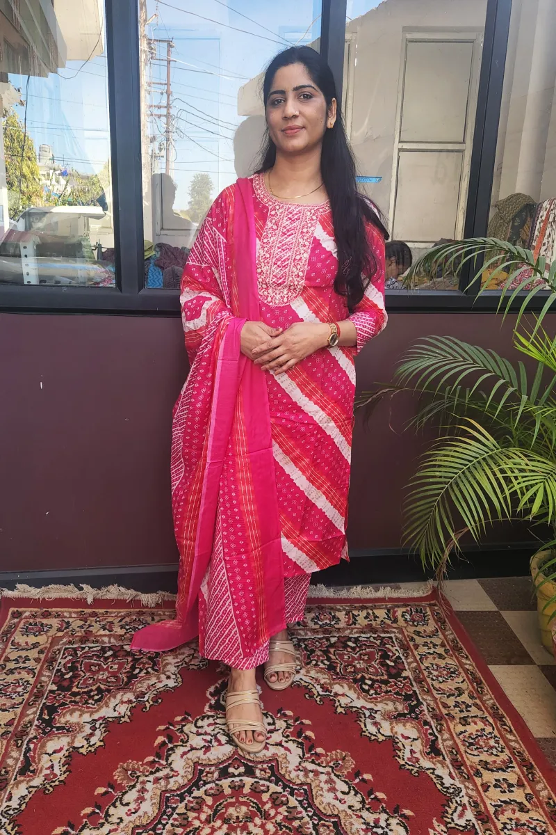 Add a refreshing touch to your ethnic wardrobe with this Semi Cotton Straight Kurti Set in soft pink tones. Featuring traditional Lehriya print, embroidered neckline, and a geometric patterned dupatta, this straight-fit kurti set is perfect for festive gatherings, casual outings, or everyday wear.