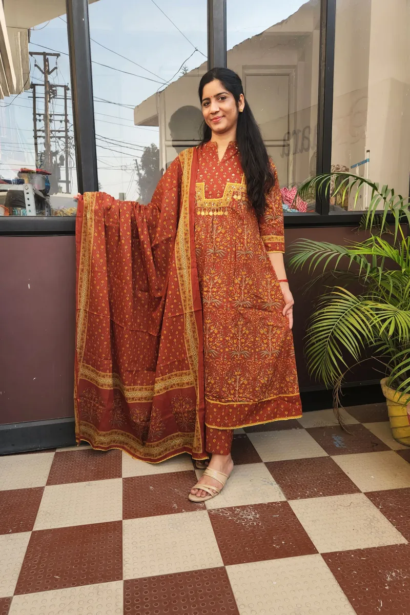 Elegant Rust Cotton Anarkali Kurti Set with Dupatta